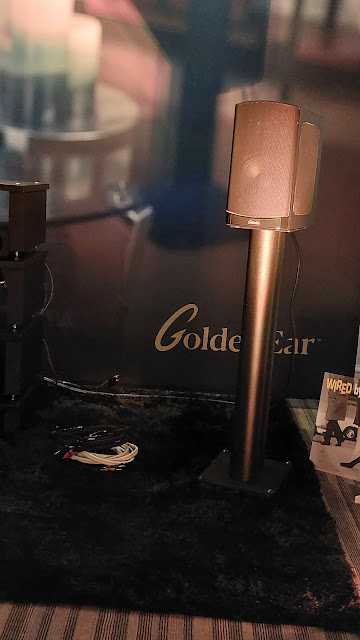 Just across the corridor from a £100k system that was difficult to listen to, Goldenear brought a system based around Heed electronics, Audioquest cables and their BRX standmounts that feature AMT tweeters and twin sidemounted passive radiators for the bass loading. A system that comes in at under £5k was by far a more musical experience than across the corridor. Not the same level of detail, but engaging - you wanted to listen and listen to more, as opposed to wanting to leave the room. Goldenear demonstrated the system with and without the subwoofer. This added bass (as you might expect) and cleaned up female vocals (which you might not expected) but also made the timing of the music more sluggish. I preferred the system without, but more experimentation or a different room (this was a small room) may have given a different result.